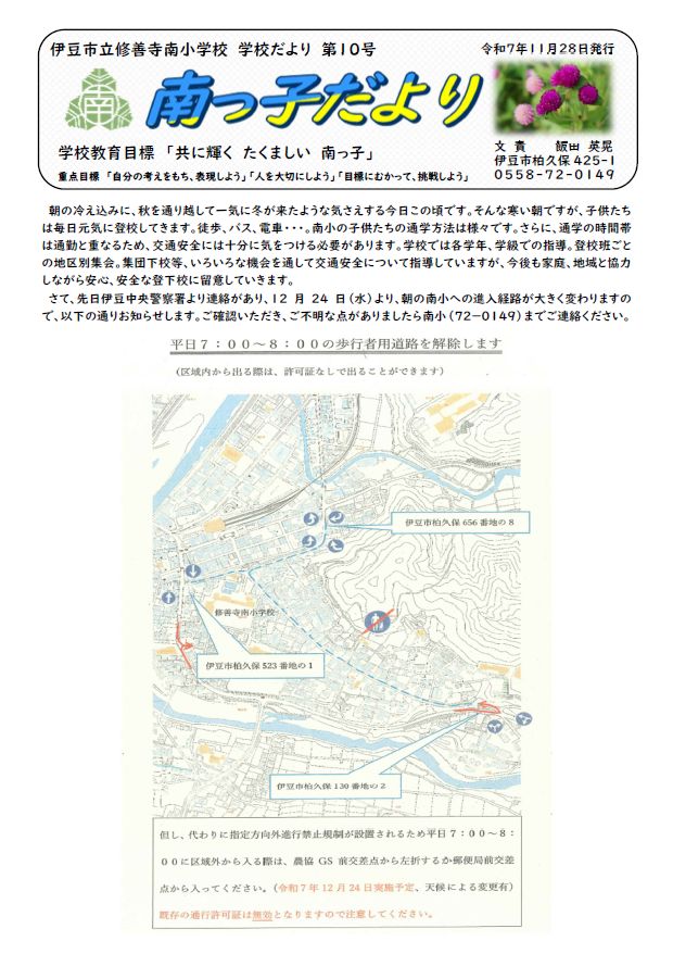 新年、明けましておめでとうござます。本年も、どうぞよろしくお願いいたします。各家庭では、新しい年、令和7年(2025年)をどのように迎えたでしょうか。昨年末から猛威を振るっているインフルエンザの流行もまだまだ心配なところではありますが、修善寺南小学校では、去る1月7日に無事3学期の始業式を行うことができました。元気な子供たちの姿に触れ、職員一同、「子供たちと一緒に、新しい年もがんばっていこう」と思いを新たにしたところです。さて、3学期は全部で49日間の短い学期となります。学校ではよく、「1月は「行く」、2月は「逃げる」、3月は「去る」」と例えられるように、あっという間に時間が過ぎていきます。しかし、学校行事に目をやると、南っ子学習発表会や6年生に感謝する会、卒業式とまだまだ大きな行事が目白押しです。・・・・