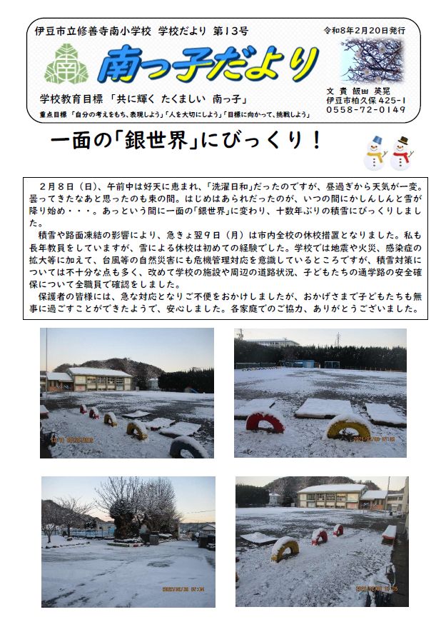 積雪や路面凍結の影響により、急きょ翌9日(月)は市内全校の休校措置となりました。私も長年教員をしていますが、雪による休校は初めての経験でした。学校では地震や火災、感染症の拡大等に加えて、台風等の自然災害にも危機管理対応を意識しているところですが、積雪対策については不十分な点も多く、改めて学校の施設や周辺の道路状況、子どもたちの通学路の安全確保について全職員で確認をしました。